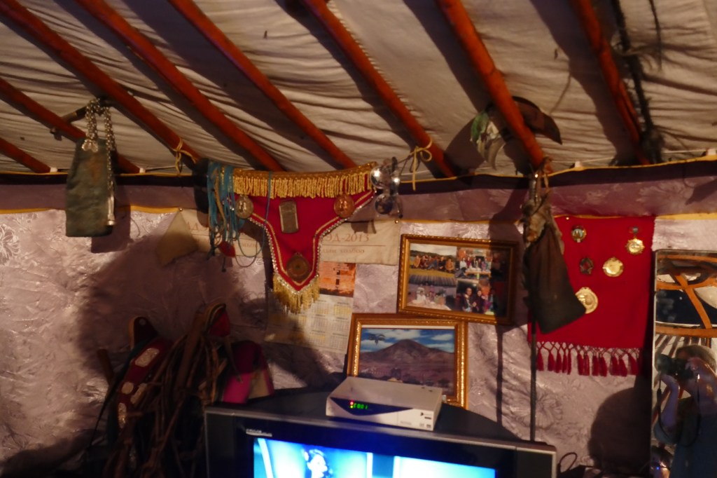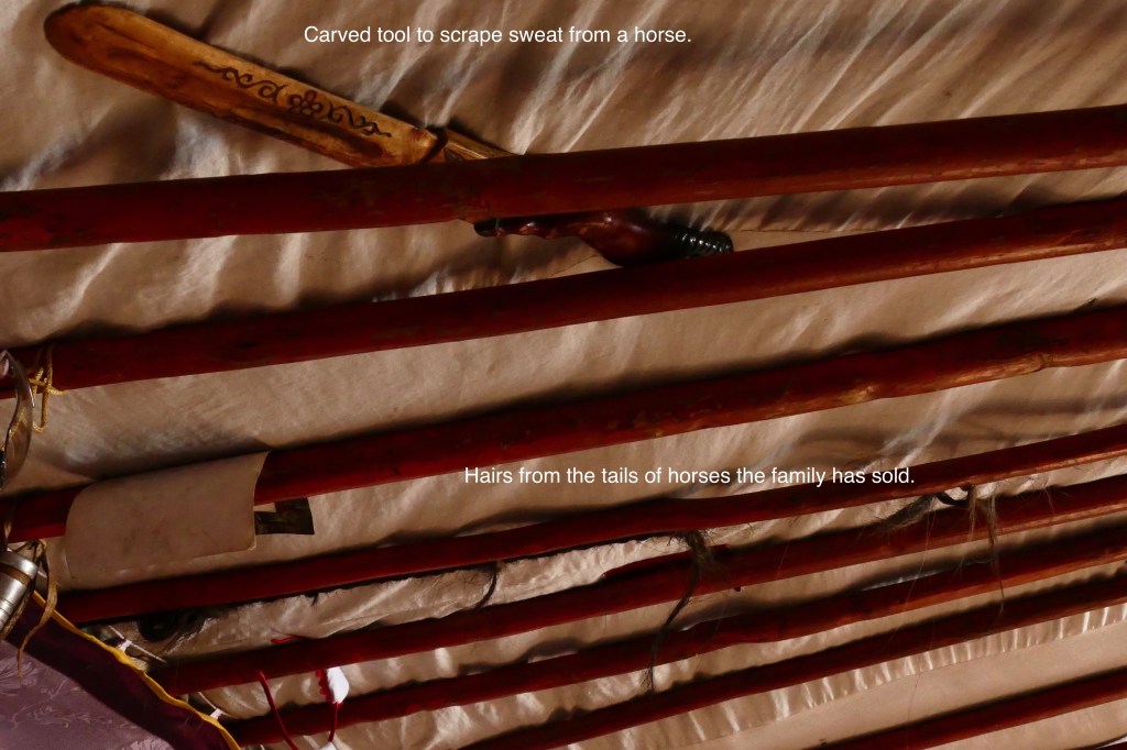 In fact, people don’t just store useful objects. You might think that living in such a small space would mean that people don’t keep anything that they don’t use every day. You would be wrong! Just as you probably have things that you treasure or that have religious or family meaning, people who live in gers keep the things that remind them of their families and activities they love.