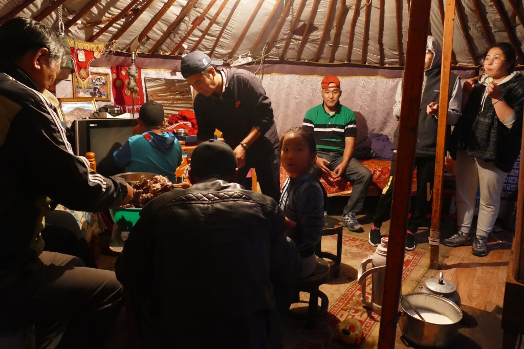 Four or five beds are placed around the walls of the ger and are used as benches during the day.