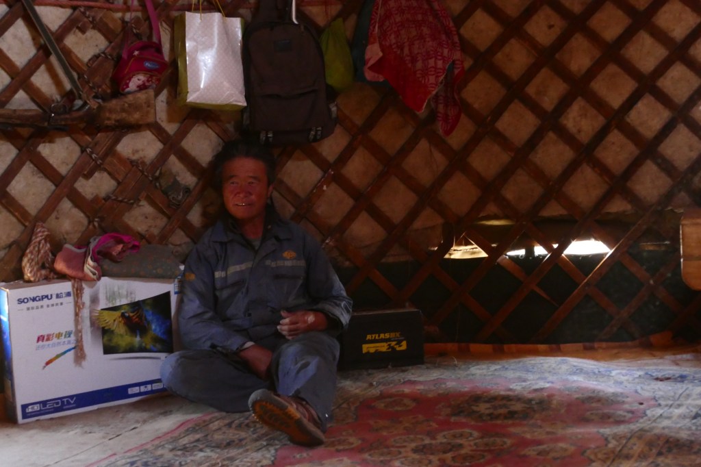 If you look at this picture of a herder in his home, he is sitting next to a large automobile battery that can store some power for his household. The sun, of course, is only shining on his ger during the day, and only when the clouds don’t cover it. By using the sun’s light to charge large batteries, his family stores electricity to use during the night and on cloudy days.